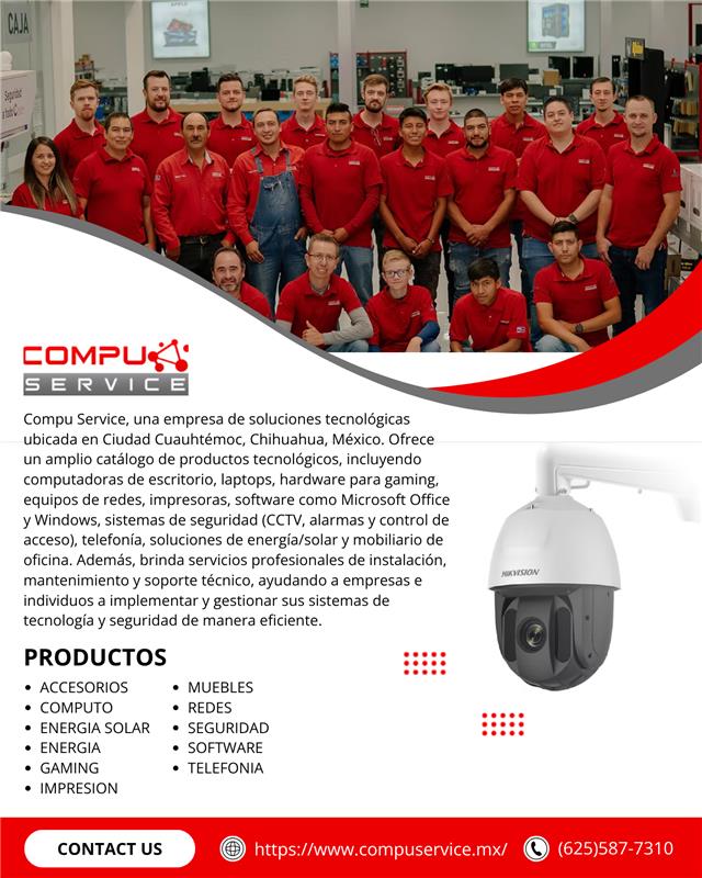 Compu Service, una empresa de soluciones tecnológicas ubicada en Ciudad Cuauhtémoc, Chihuahua, México. Ofrece un amplio catálogo de productos tecnológicos, incluyendo computadoras de escritorio, laptops, hardware para gaming, equipos de redes, impresoras, software como Microsoft Office y Windows, sistemas de seguridad (CCTV, alarmas y control de acceso), telefonía, soluciones de energía/solar y mobiliario de oficina. Además, brinda servicios profesionales de instalación, mantenimiento y soporte técnico, ayudando a empresas e individuos a implementar y gestionar sus sistemas de tecnología y seguridad de manera eficiente.