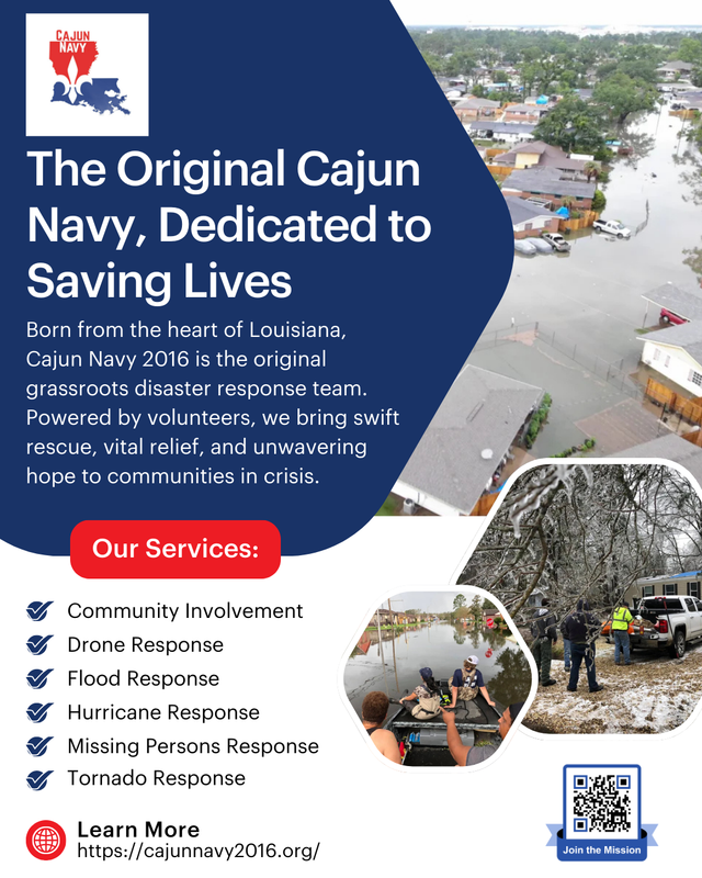 Cajun Navy 2016 is a Louisiana-based nonprofit organization dedicated to rapid disaster relief, response, and rescue services. Powered by volunteers and community support, they provide critical assistance during hurricanes, floods, and other natural disastersdelivering supplies, conducting search and rescue operations, and offering aid to affected communities. With a mission rooted in compassion and action, Cajun Navy 2016 stands at the frontlines of emergencies, helping those in need when every second counts.