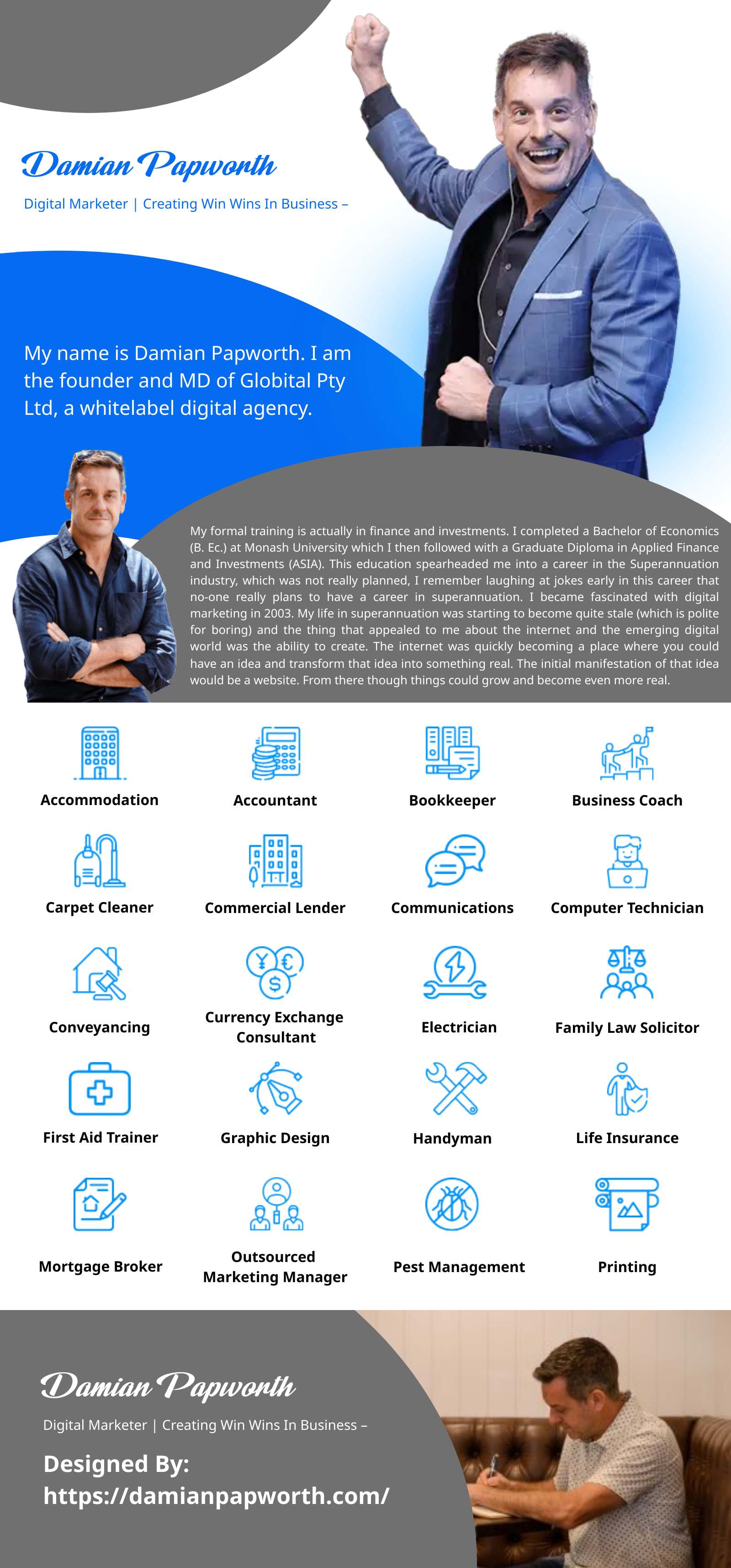 My name is Damian Papworth. I am the founder and MD of Globital Pty Ltd, a global wholesale digital marketing company.