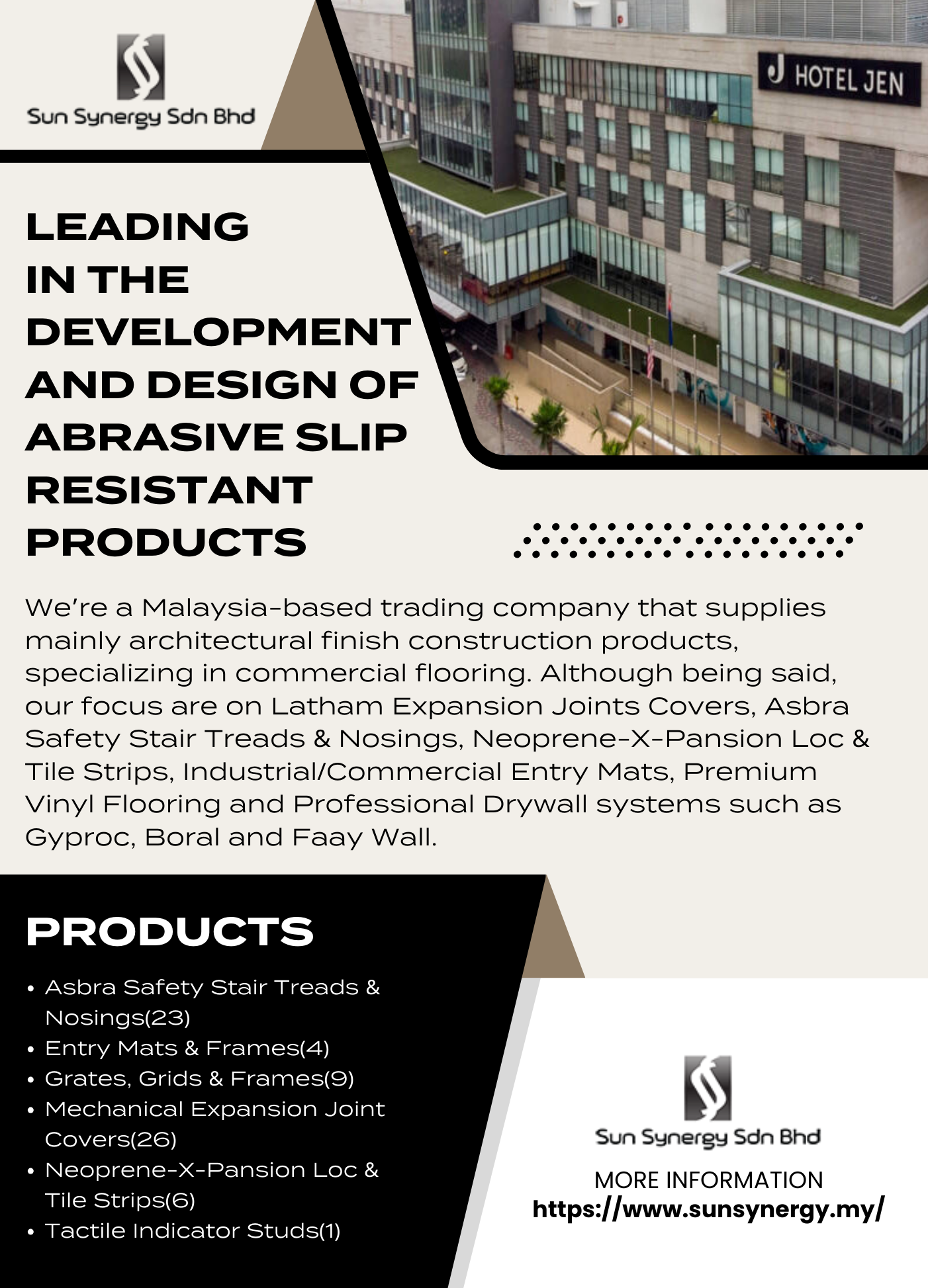 We’re a Malaysia-based trading company that supplies mainly architectural finish construction products, specializing in commercial flooring. Although being said, our focus are on Latham Expansion Joints Covers, Asbra Safety Stair Treads & Nosings, Neoprene-X-Pansion Loc & Tile Strips, Industrial/Commercial Entry Mats, Premium Vinyl Flooring and Professional Drywall systems such as Gyproc, Boral and Faay Wall.