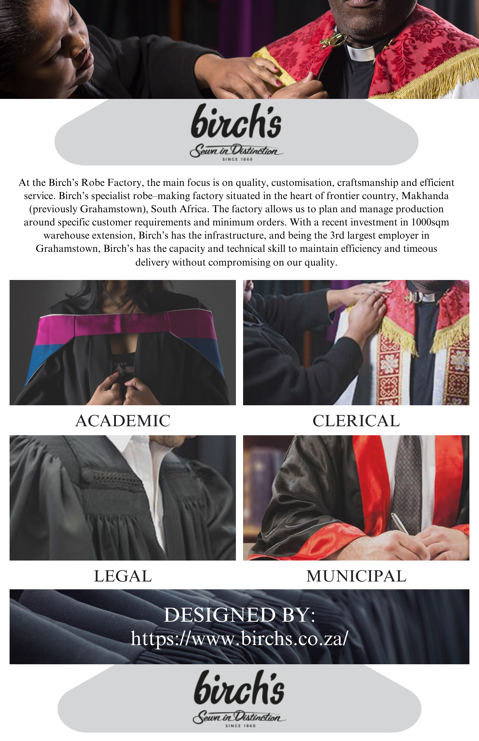 Birch's has been sewn in distinction since 1860. We manufacture only the greatest quality robes at an affordable price. Our graduation robes, clerical robes, legal robes, municipal robes and more are all manufactured in Makhanda (Grahamstown) in the Eastern Cape of South Africa.