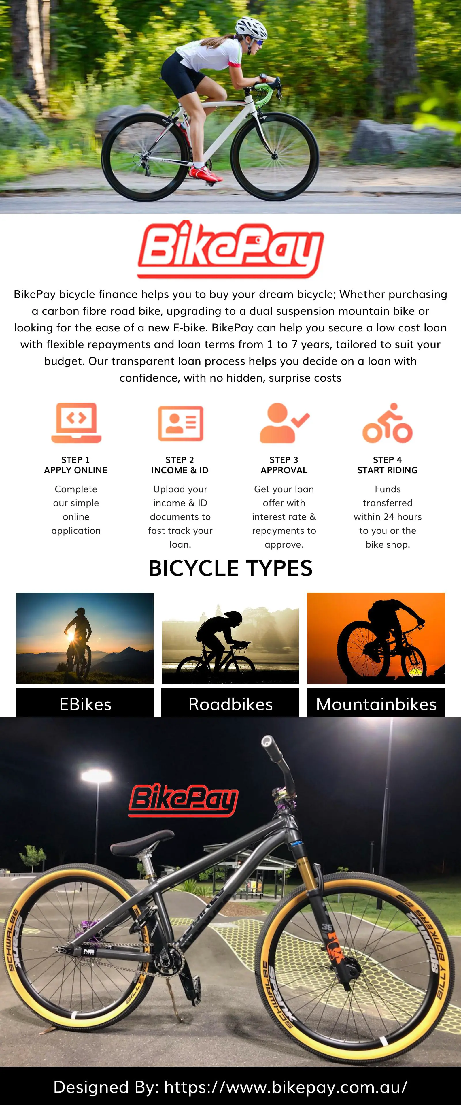 BikePay bicycle finance helps you to buy your dream bicycle; Whether purchasing a carbon fibre road bike, upgrading to a dual suspension mountain bike or looking for the ease of a new E-bike. BikePay can help you secure a low cost loan with flexible repayments and loan terms from 1 to 7 years, tailored to suit your budget. Our transparent loan process helps you decide on a loan with confidence, with no hidden, surprise costs.