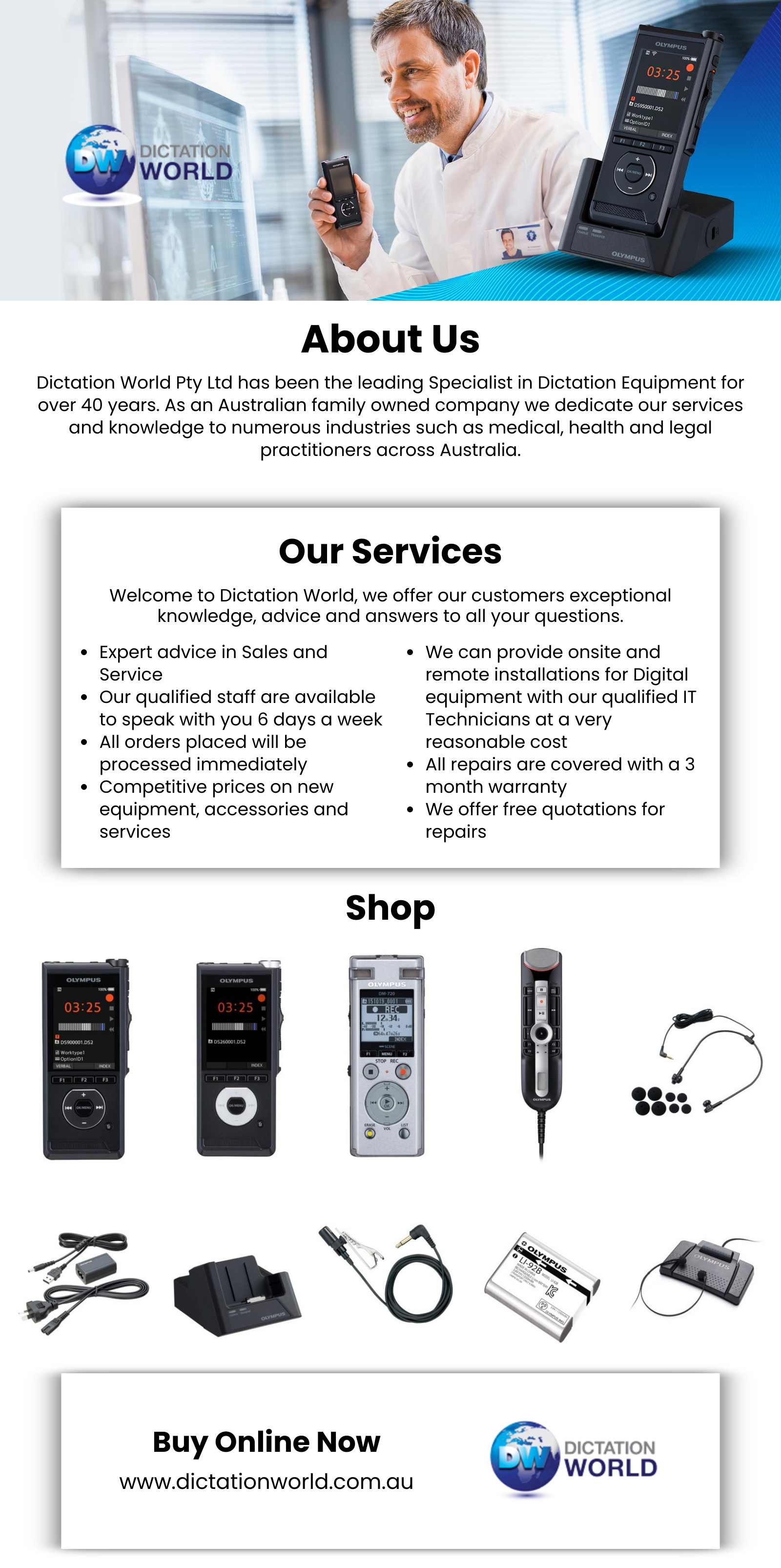 Dictation World Pty Ltd has been the leading Specialist in Dictation Equipment for over 40 years. As an Australian family owned company, we dedicate our services and knowledge to numerous industries such as medical, health and legal practitioners across Australia.