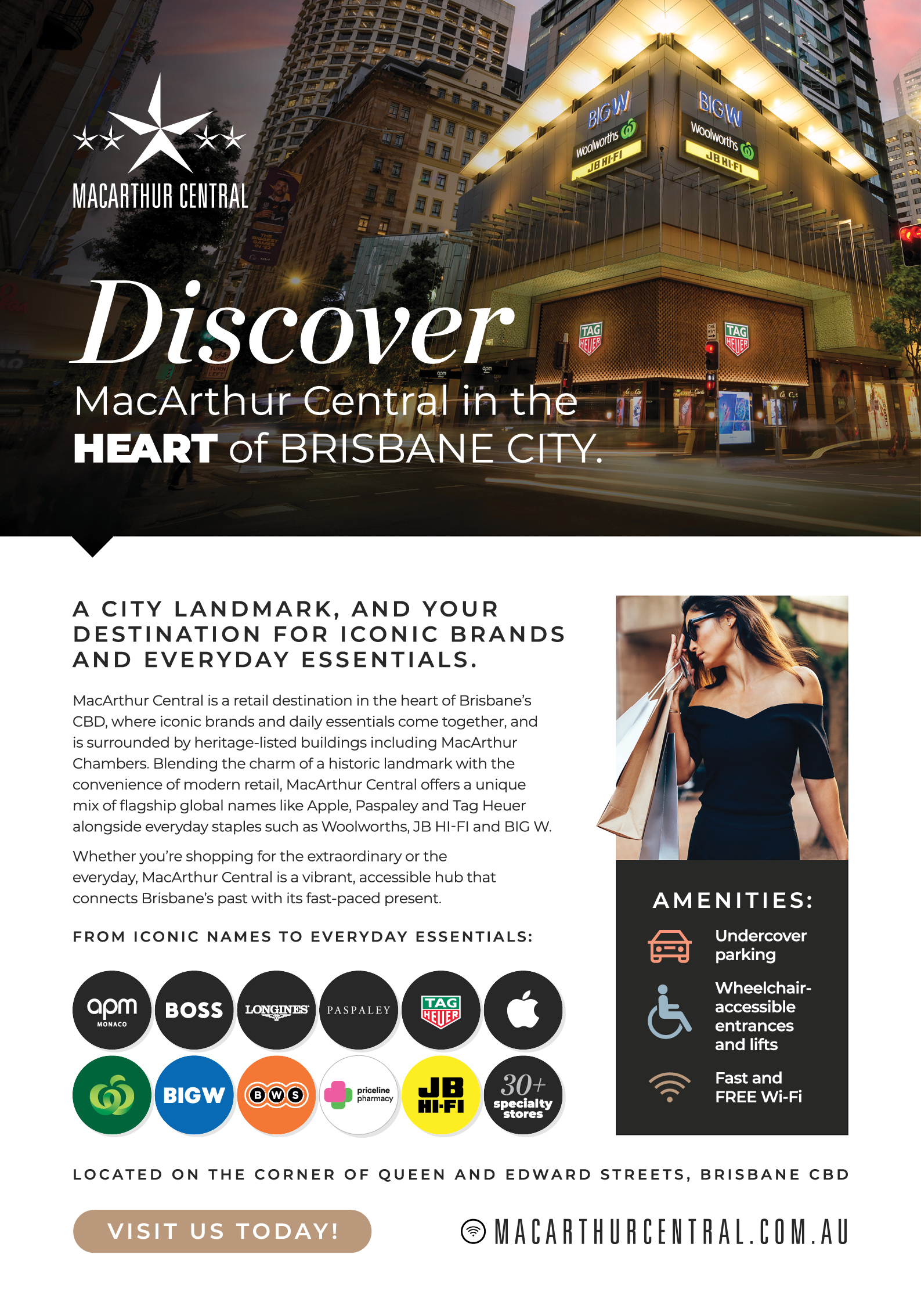 MacArthur Central is a premium retail destination located in the heart of Brisbane’s CBD, directly adjacent to Queen Street Mall. The centre blends everyday convenience with luxury shopping, featuring a mix of global brands including Apple (Australia’s largest store), Tag Heuer, Paspaley, Longines, and Hugo Boss.
